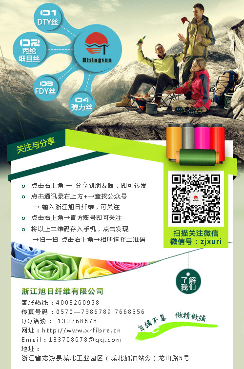 我們浙江旭日纖維有限公司專業(yè)研發(fā)、生產(chǎn)丙綸彈力絲,其優(yōu)越性能我們當然了解。如果你要了解我們丙綸彈力絲的更多信息,關(guān)注我們噢!掃掃微信二維碼我們陪你灑脫過秋!